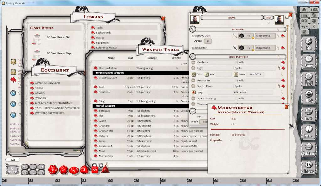 For players, Fantasy Grounds will allow you to connect to a game being hosted by a GM and control one or more characters within the game. You will be able to update and maintain your character sheet, much like you would in a face-to-face RPG game, but with some degree of automation and support for dragging and dropping abilities and items from the Library modules (for rulesets which support them.) Whenever a GM shares a map image, you will be able to move a token representing your character and initiate attack rolls against enemies visible on those maps when it is your turn. You will be interacting within the GM's game session with other players and every action you take will be communicated to the GM and connected players along with any chat messages you enter into the chat window. At the conclusion of the GM's game session, you will log out and your character sheet and progress will be saved to the GM's session. When you meet back up and a pre-scheduled time with the GM for the next session, you will be able to continue where you left off. Scheduling of future game sessions is handled outside of Fantasy Grounds via email communication, the Fantasy Grounds forums and Game Calendar, Steam discussions or through whatever source the GM defines. SmiteWorks hopes to improve the match-making features at a later date.